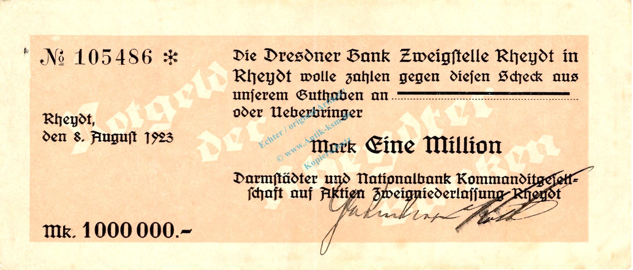 Rheydt , Banknote 1 Million Mark Scheck L-gbr. Keller 4563.g , Rheinland 1923 Inflation