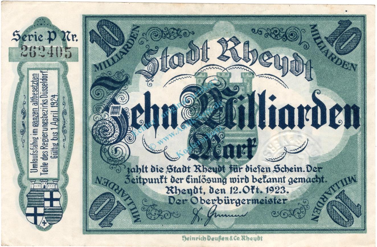 Rheydt , Banknote 10 Milliarden Mark Schein L-gbr. Keller 4561.u , Rheinland 1923 Inflation