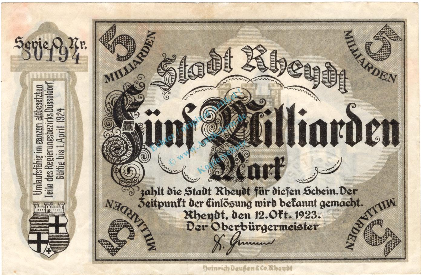 Rheydt , Banknote 5 Milliarden Mark Schein gbr. Keller 4561.u , Rheinland 1923 Inflation