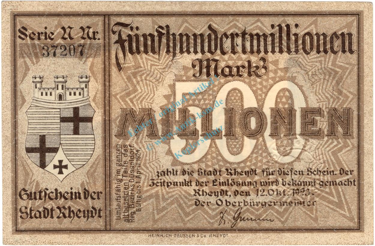 Rheydt , Banknote 500 Millionen Mark Schein L-gbr. Keller 4561.r , Rheinland 1923 Inflation