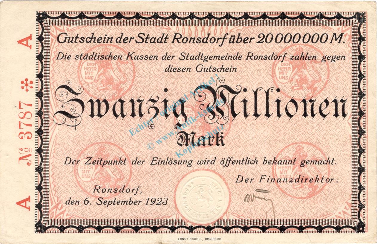 Ronsdorf , Banknote 20 Millionen Mark Scheck L-gbr. Keller 4618.d , Rheinland 1923 Inflation