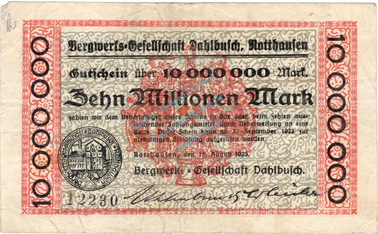 Rotthausen , Banknote 10 Millionen Mark Schein gbr. Keller 4652.b , Rheinland 1923 Inflation