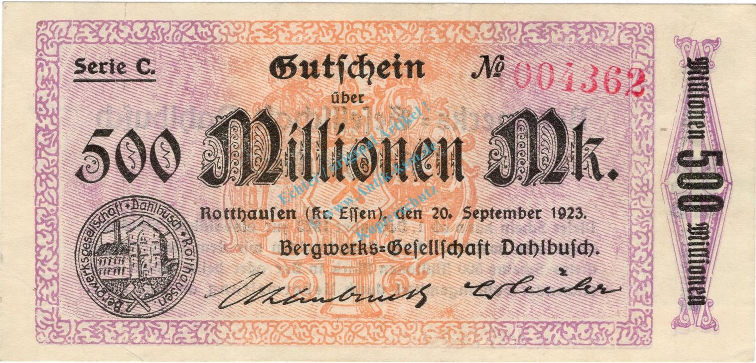 Rotthausen , Banknote 500 Millionen Mark Schein unc-kfr. Keller 4652.c , Rheinland 1923 Inflation