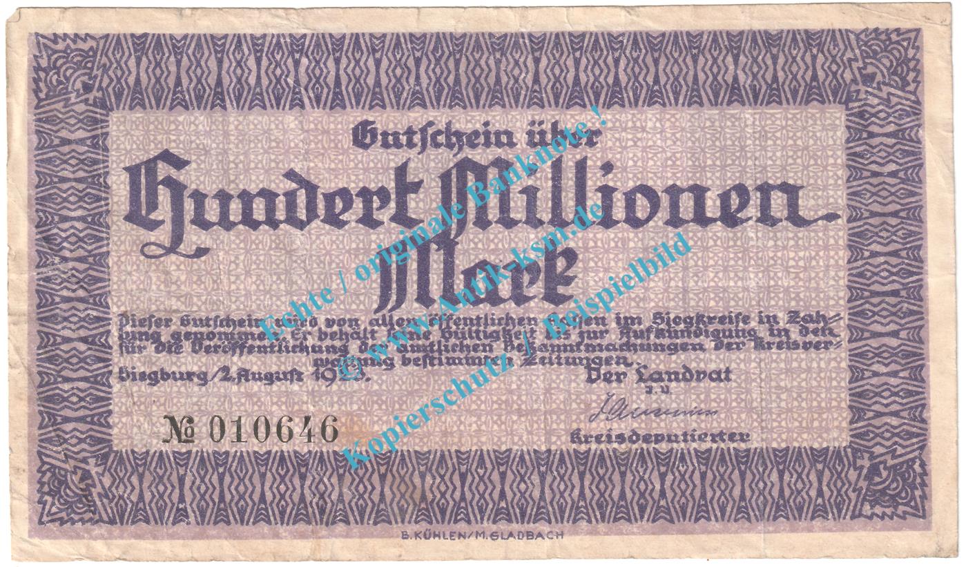 Siegburg , Notgeld 100 Millionen Mark Schein in gbr. Keller 4777.d , Rheinland 1923 Grossnotgeld Inflation