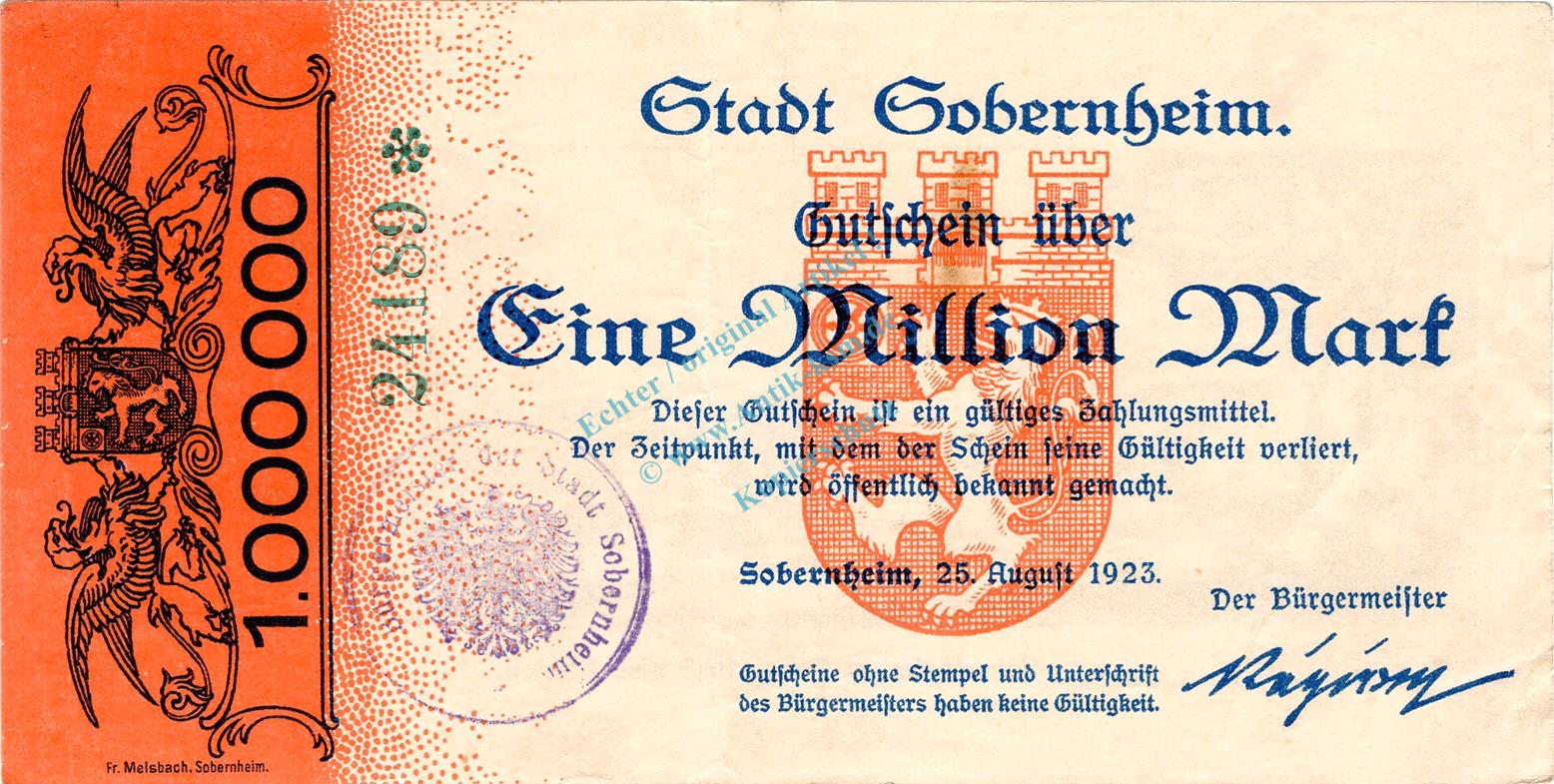 Sobernheim , Banknote 1 Million Mark Schein F-kfr. Keller 4801.f , Rheinland 1923 Inflation