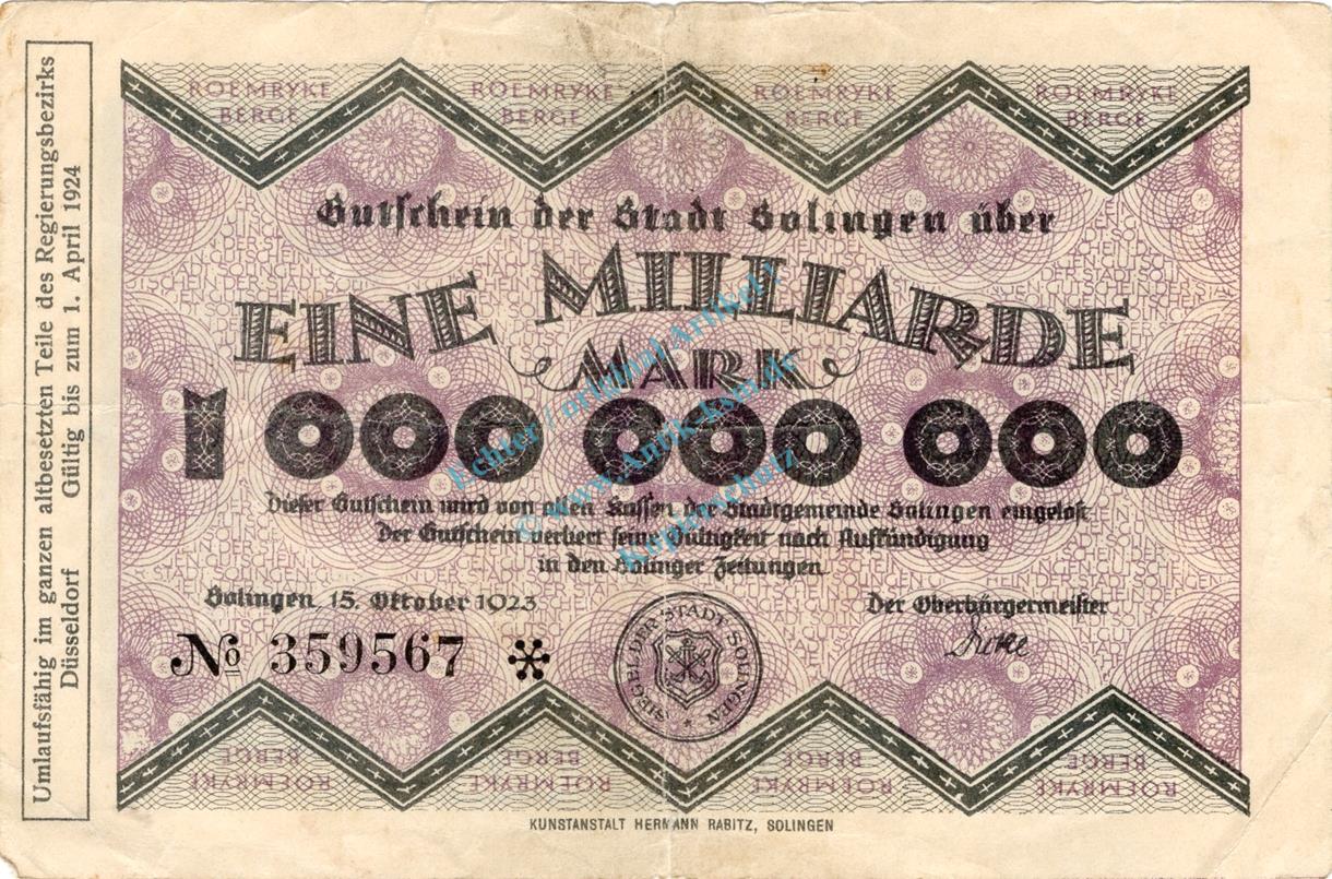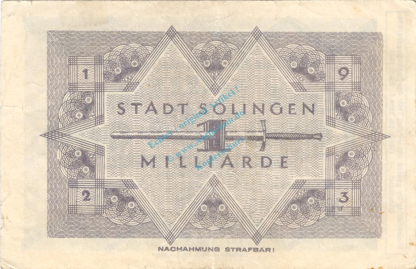 Solingen , Banknote 1 Milliarde Mark Schein in gbr. Keller 4809.q , Rheinland 1923 Inflation