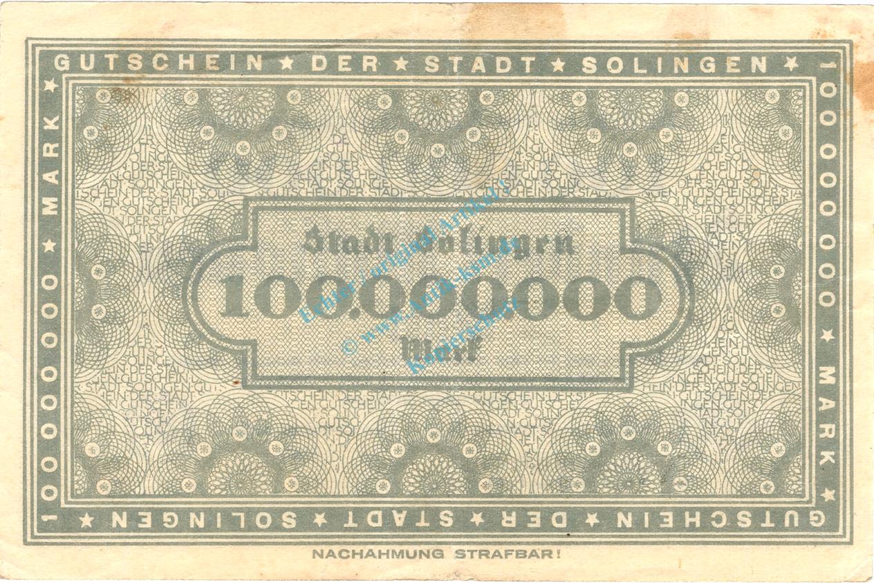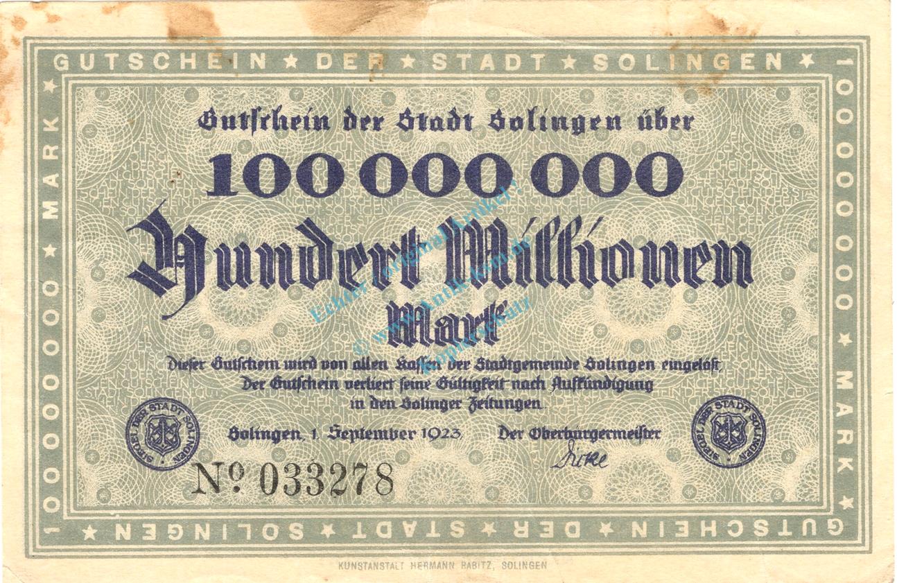 Solingen , Banknote 100 Millionen Mark Schein in gbr. Keller 4809.g , Rheinland 1923 Inflation