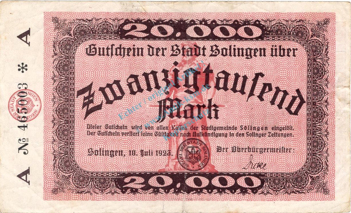 Solingen , Banknote 20.000 Mark Schein in gbr Keller 4809.a , Rheinland 1923 Inflation
