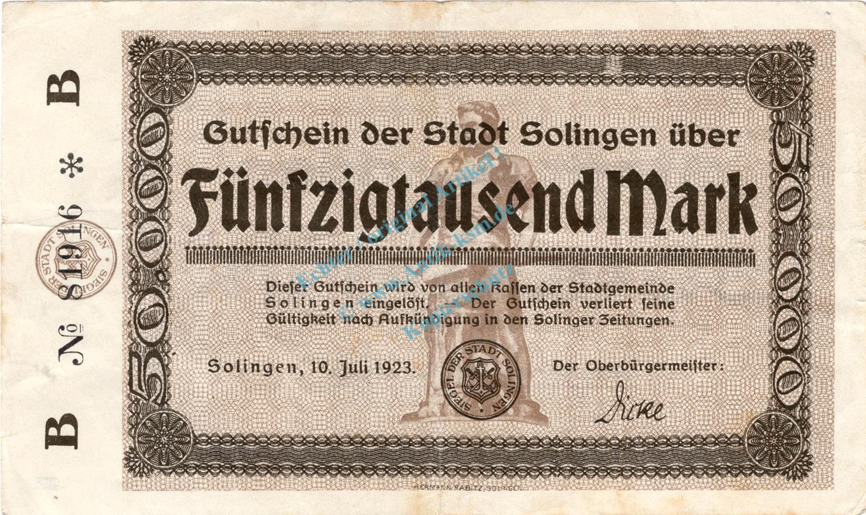 Solingen , Banknote 50.000 Mark Schein in gbr. Keller 4809.a , Rheinland 1923 Inflation