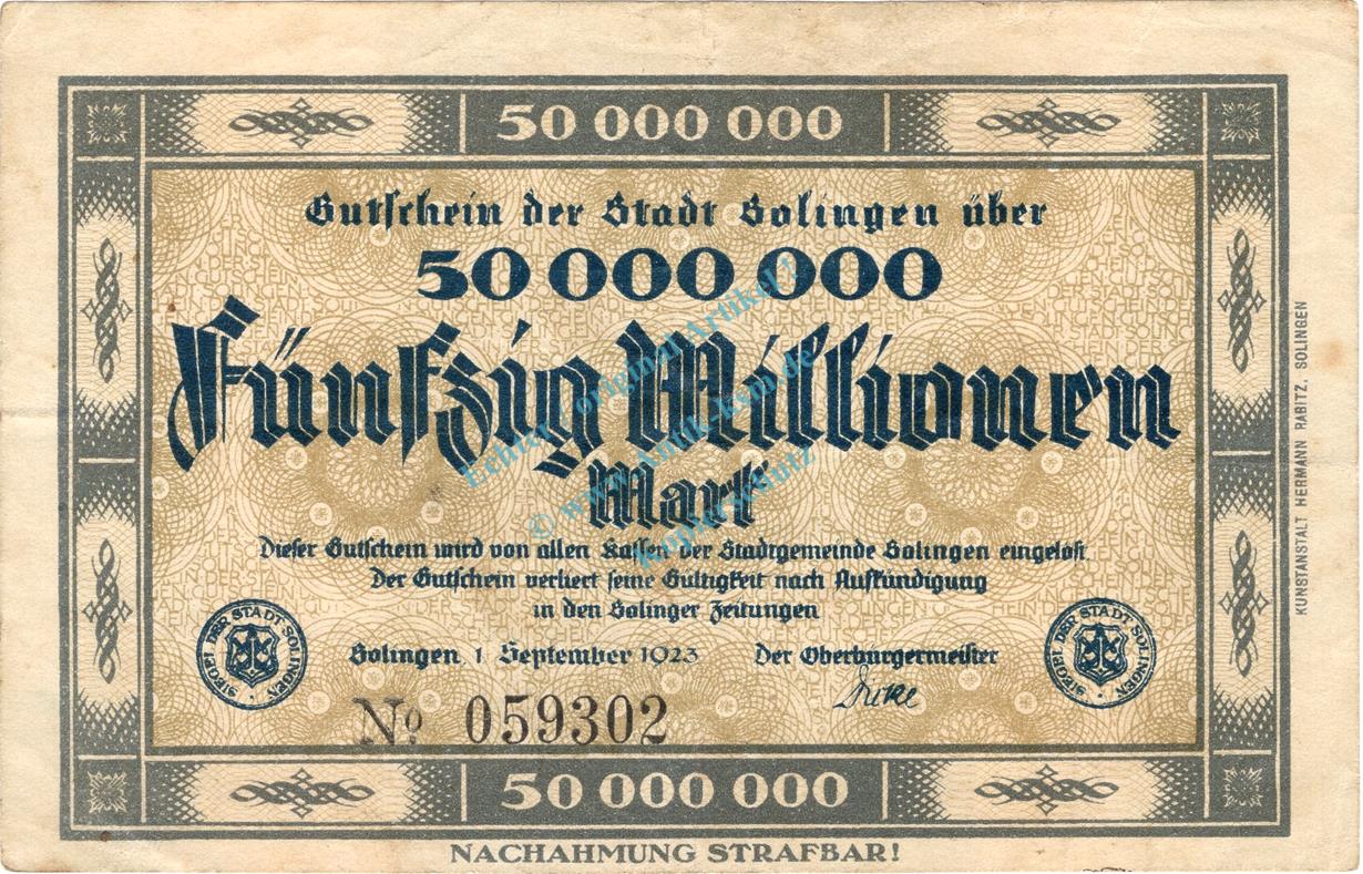 Solingen , Banknote 50 Millionen Mark Schein in gbr. Keller 4809.g , Rheinland 1923 Inflation