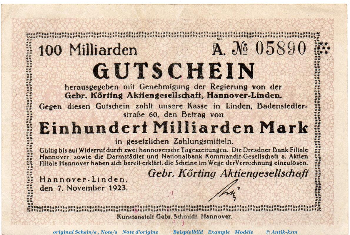 Banknote Gebr. Körting Hannover-Linden , 100 Milliarden Mark gbr. Keller 2187. , 07.11.1923 , Niedersachsen Großnotgeld Inflation