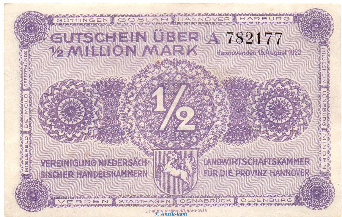 Banknote Handelskammer Hannover , halbe Million Mark Schein -A- in kfr. Keller 2169.a von 1923 , Niedersachsen Inflation