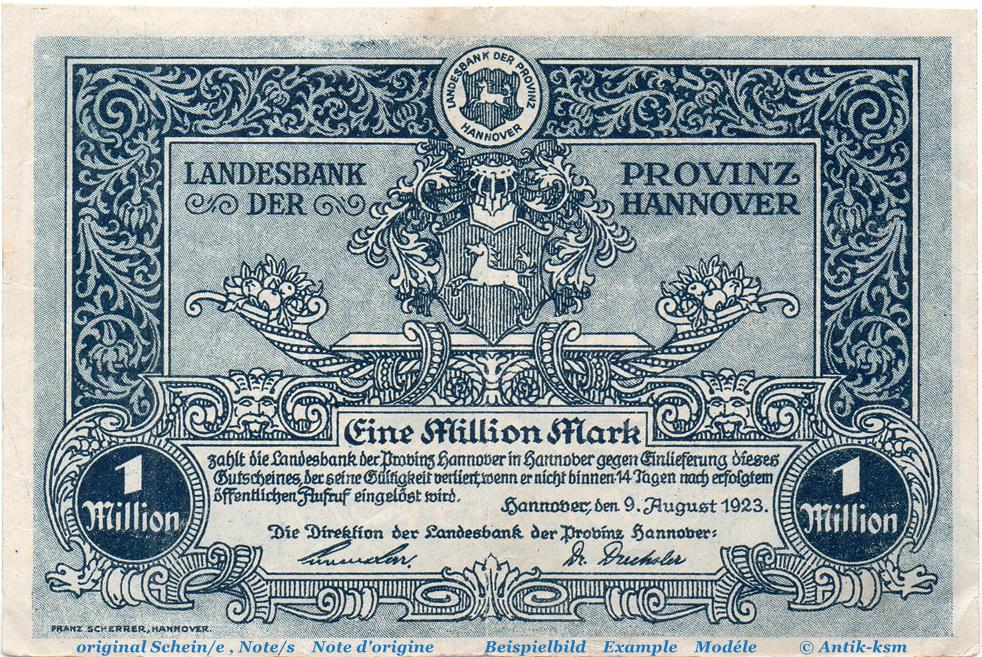 Banknote Landesbank Hannover , 1 Million Mark Schein in gbr. Keller 2162.d , 09.08.1923 , Niedersachsen Großnotgeld Inflation