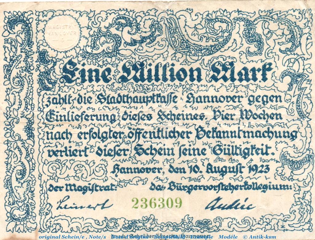 Banknote Stadt Hannover , 1 Million Mark Schein in gbr. Keller 2148.b.2 , von 1923 , Niedersachsen Inflation