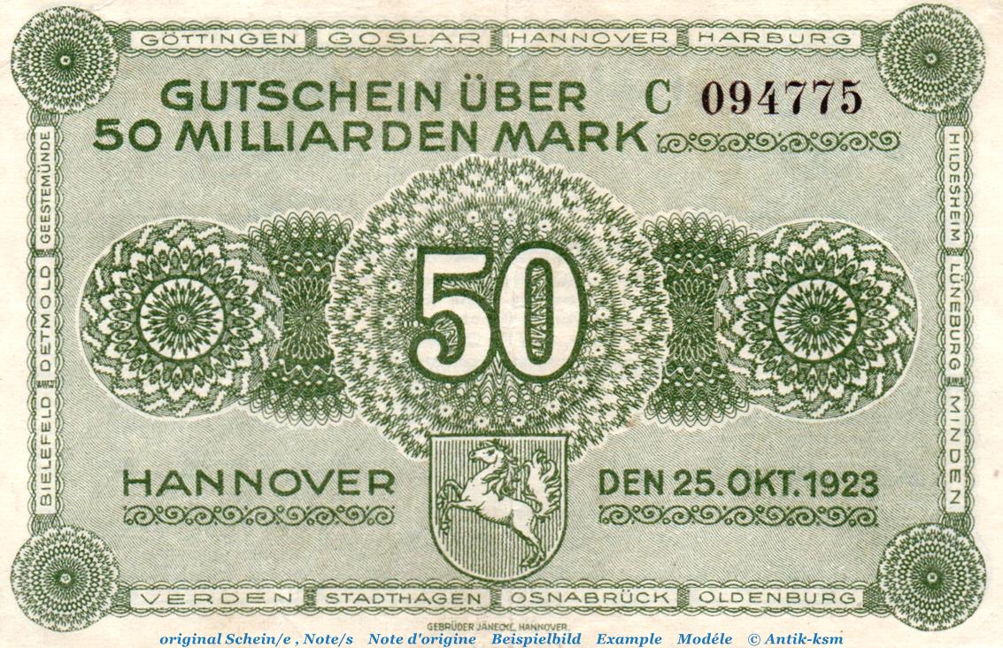 Banknote Ver. Handelskammer Hannover , 50 Milliarden Mark Schein -C- in gbr. Keller 2169.c , von 1923 , Niedersachsen Inflation