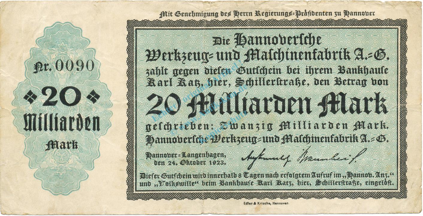 Hannover , Banknote 20 Milliarden Mark Schein gbr. Keller 2181.b , Niedersachsen 1923 Inflation
