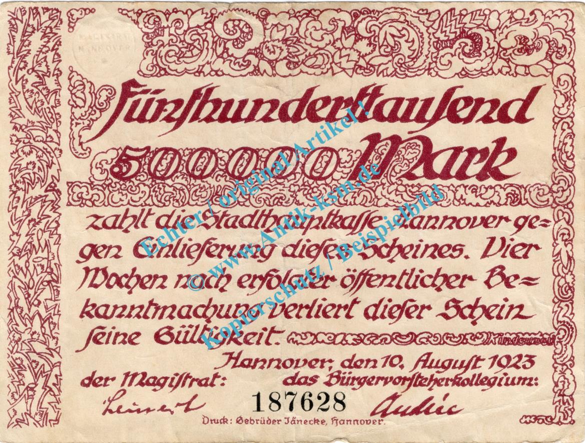 Hannover , Notgeld 500.000 Mark Schein in gbr. Keller 2148.b , Niedersachsen 1923 Grossnotgeld - Inflation