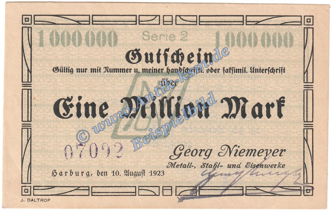 Gutschein / Banknote Eine Million Mark , Georg Niemeyer Metall-, Stahl- undEisenwerke Harburg , Großnotgeld - Inflation