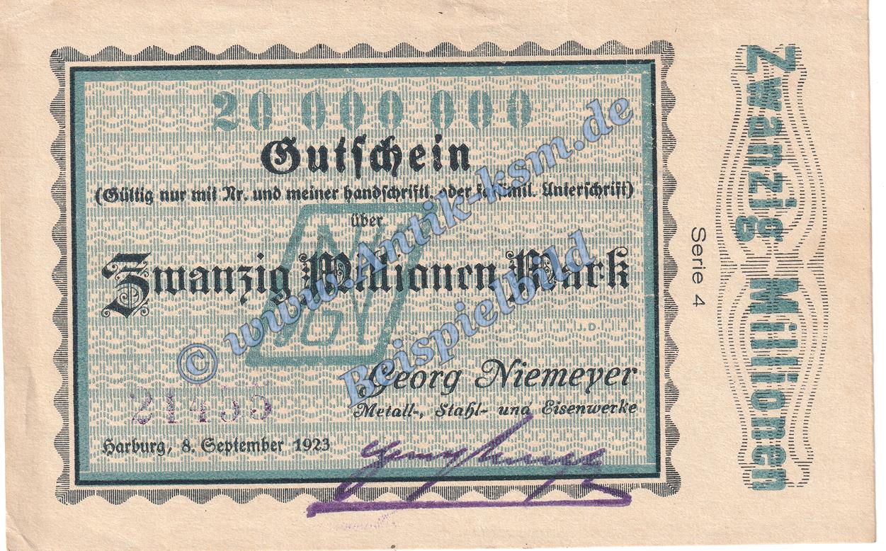 Harburg Niemeyer , Banknote 20 Millionen Mark Schein in kfr. Keller 2208.d , Niedersachsen 1923 Grossnotgeld Inflation