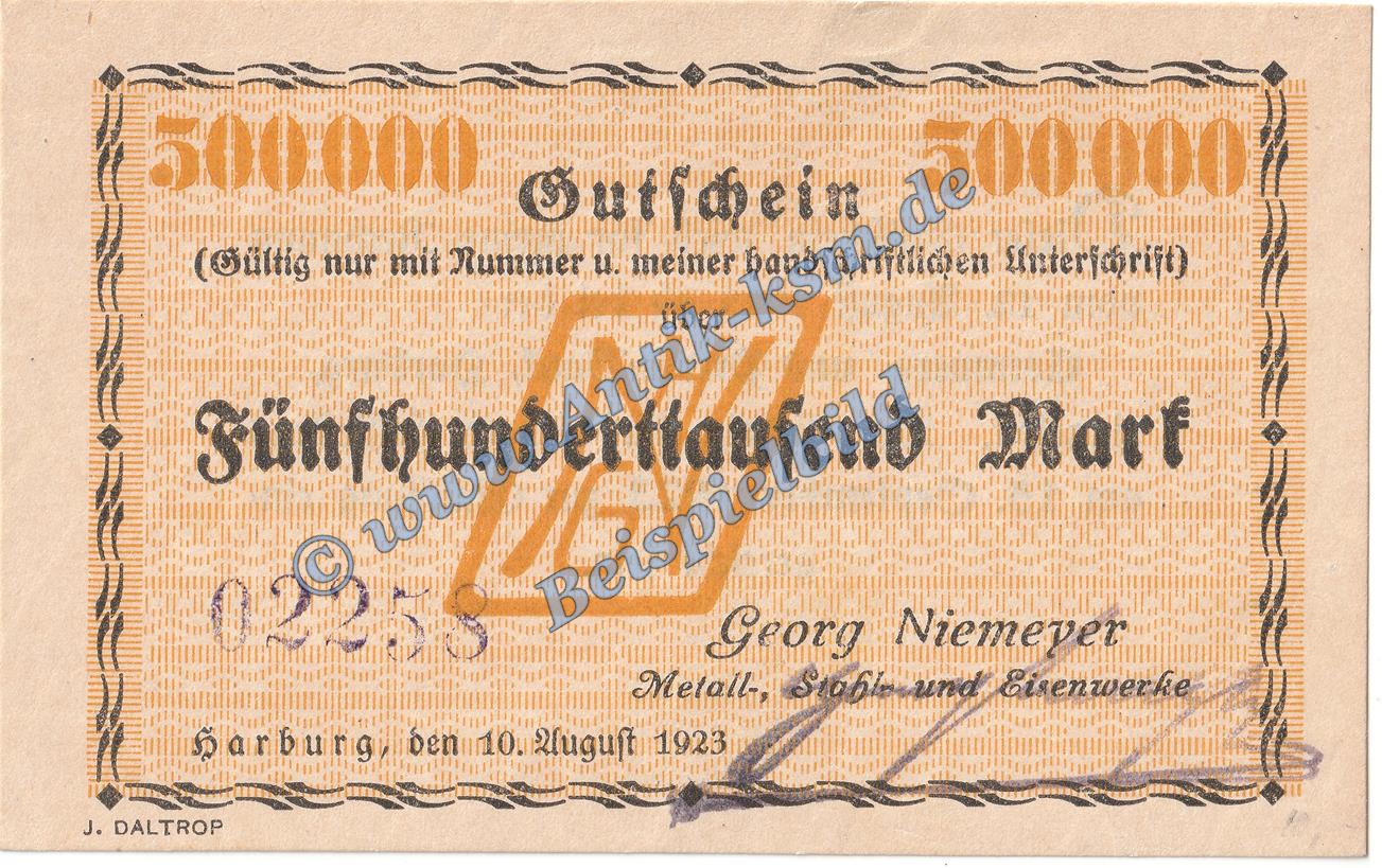 Harburg Niemeyer , Banknote 500.000 Mark Schein in kfr. Keller 2208.a , Niedersachsen 1923 Grossnotgeld Inflation