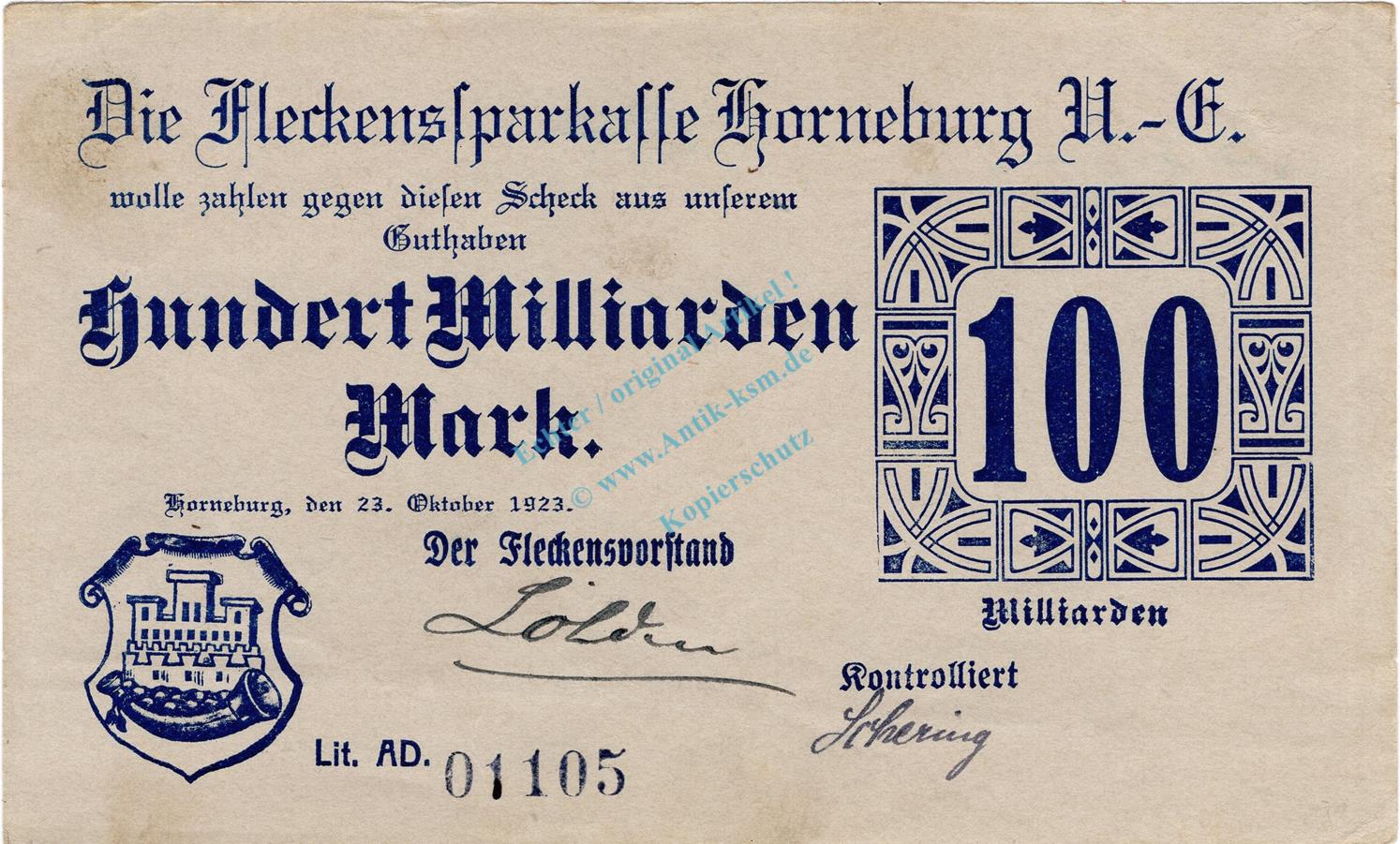 Horneburg , Banknote 100 Milliarden Mark unc-kfr. Keller 2450. Niedersachsen 1923 Inflation