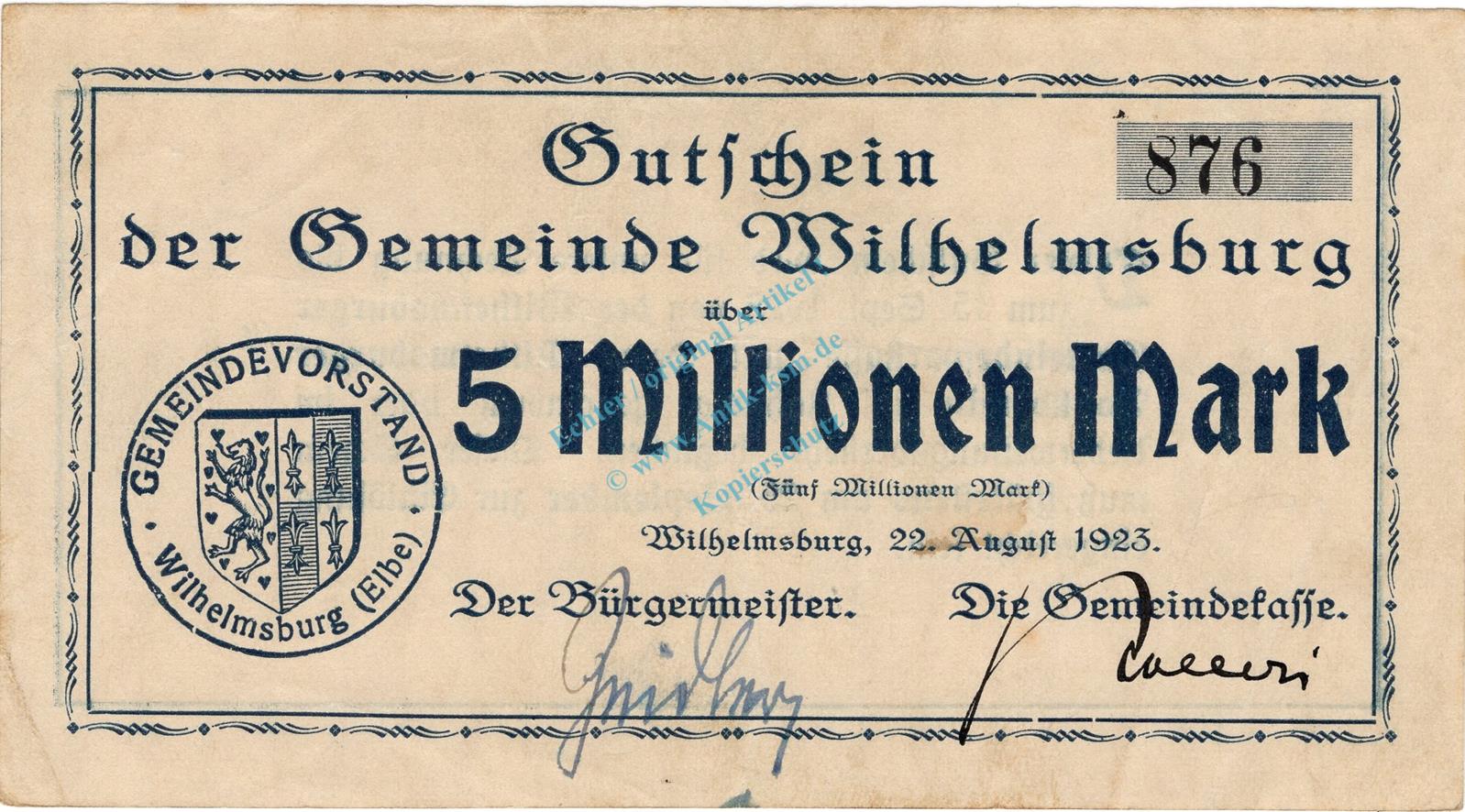 Wilhelmsburg , Banknote 5 Millionen Mark Schein in gbr. Keller 5626.a , Niedersachsen 1923 Inflation