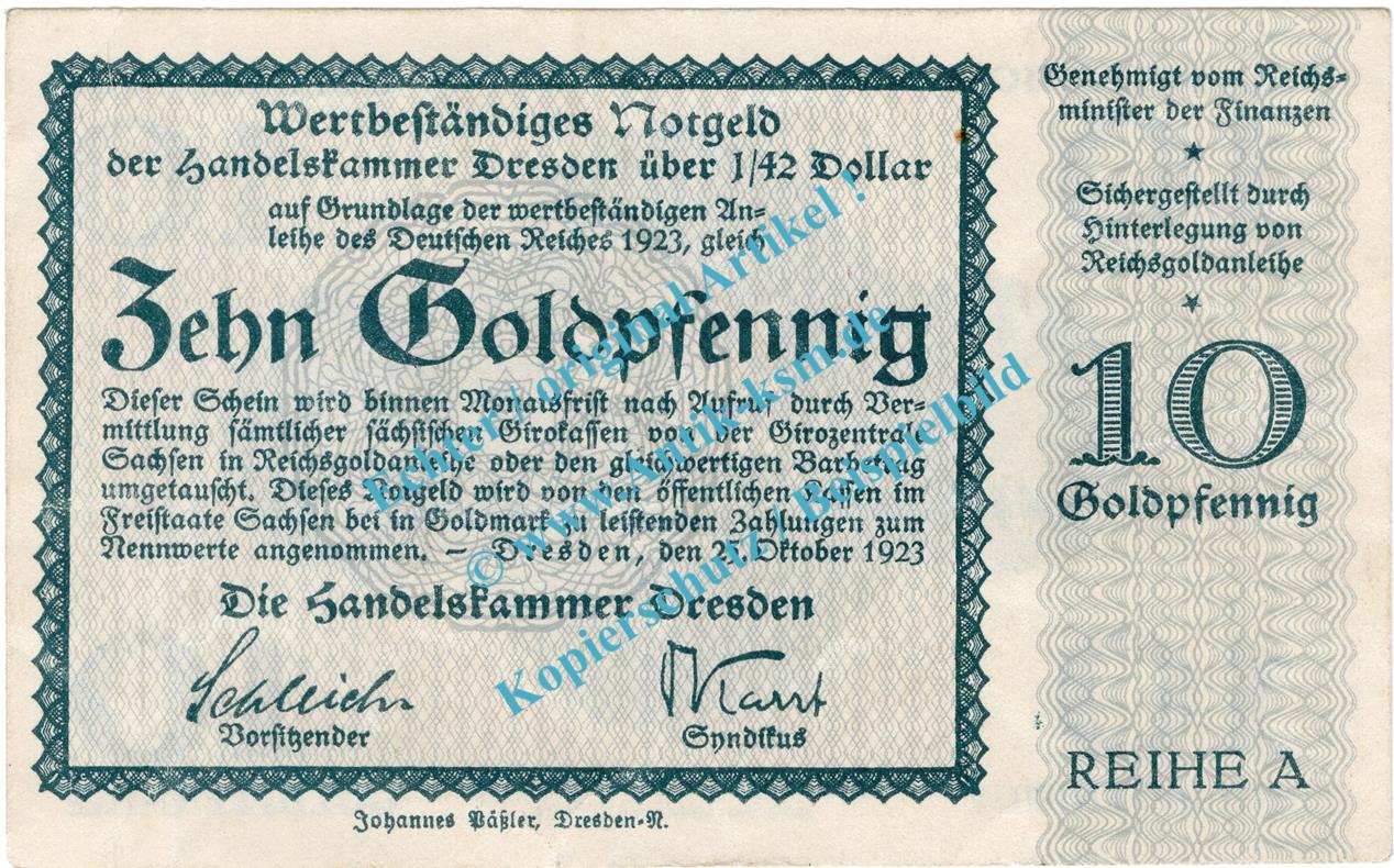 Dresden , Notgeld 10 Goldpfennig -MUSTER- Schein in L-gbr. Bühn 1181.1.d , Sachsen 1923 Wertbeständig