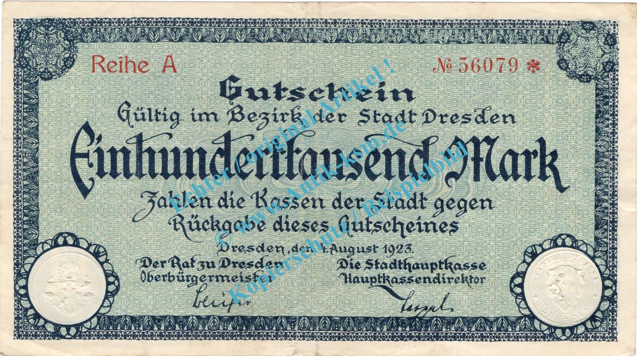 Gutschein / Banknote über Einhunderttausend Mark , Stadt Dresden , Großnotgeld 1923 Inflation