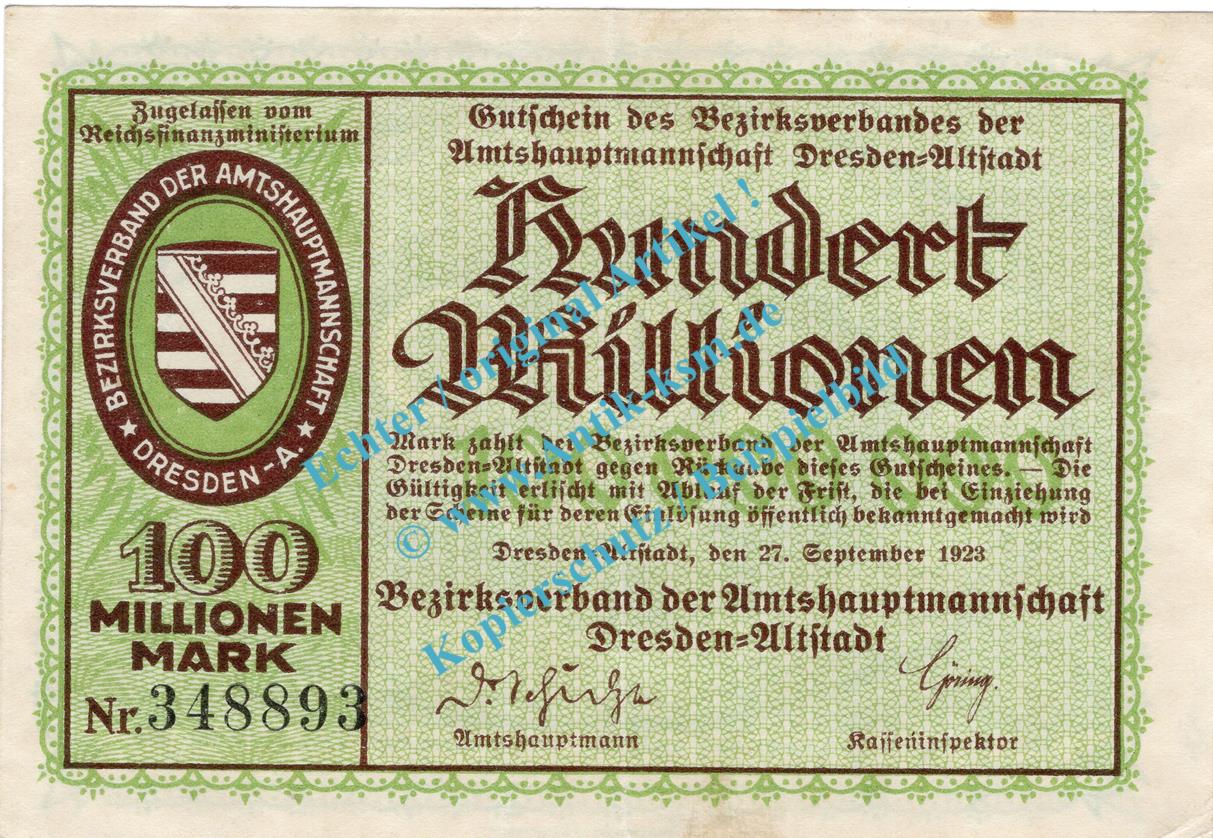 Dresden , Notgeld 100 Millionen Mark Schein in gbr. Bühn 1240.12 , Sachsen 1923 Inflation