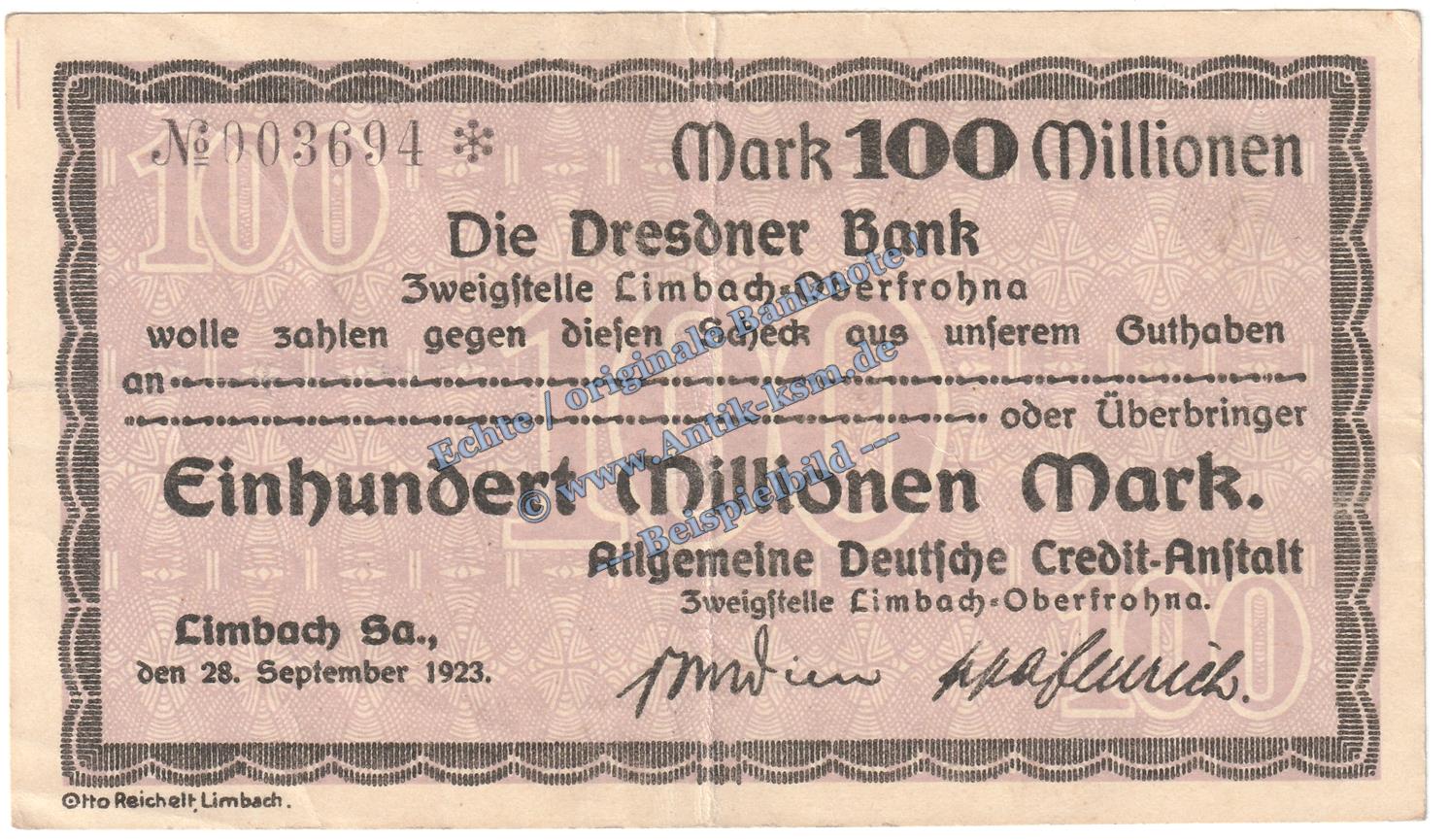 Limbach , Banknote 100 Millionen Mark Schein in gbr. Keller 3274.II.o , Sachsen 1923 Grossnotgeld - Inflation