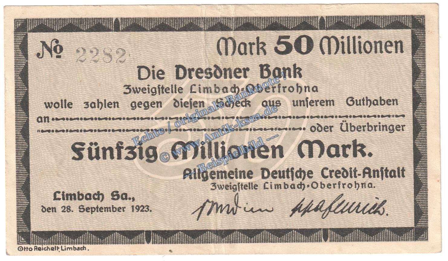 Limbach , Banknote 50 Millionen Mark Schein in gbr. Keller 3274.II.o , Sachsen 1923 Grossnotgeld - Inflation