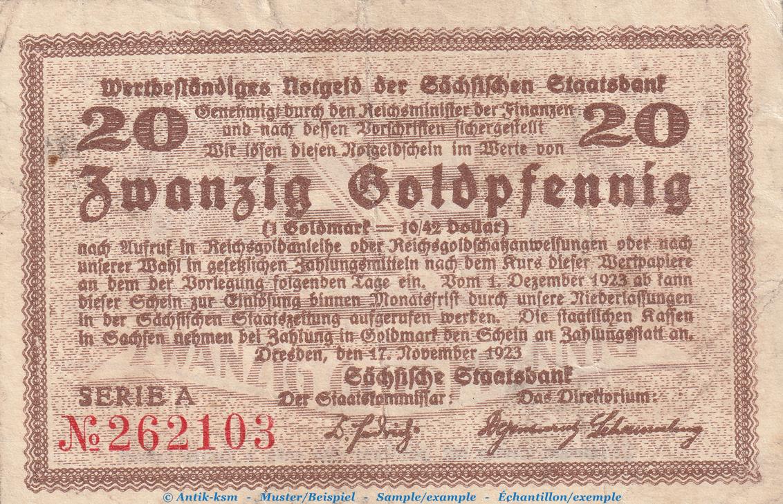 Notgeld Sächsische Staatsbank Dresden , 20 Gold Pfennig Schein in gbr. Müller 1460.4 von 1923 , Sachsen wertbeständiges Notgeld
