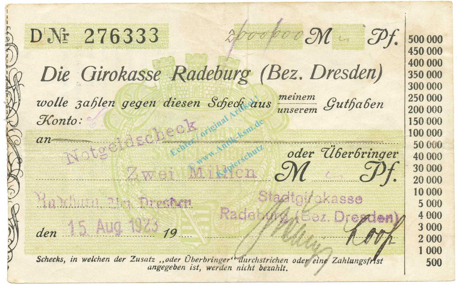 Radeburg , Banknote 2 Millionen Mark Scheck gbr. Keller 4414.k , Sachsen 1923 Inflation