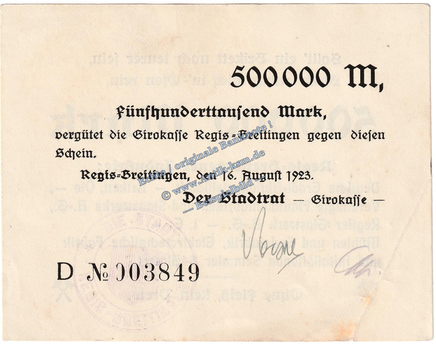 Regis Breitingen , Banknote 500.000 Mark Schein in gbr. Keller 4479.e , Sachsen 1923 Grossnotgeld - Inflation