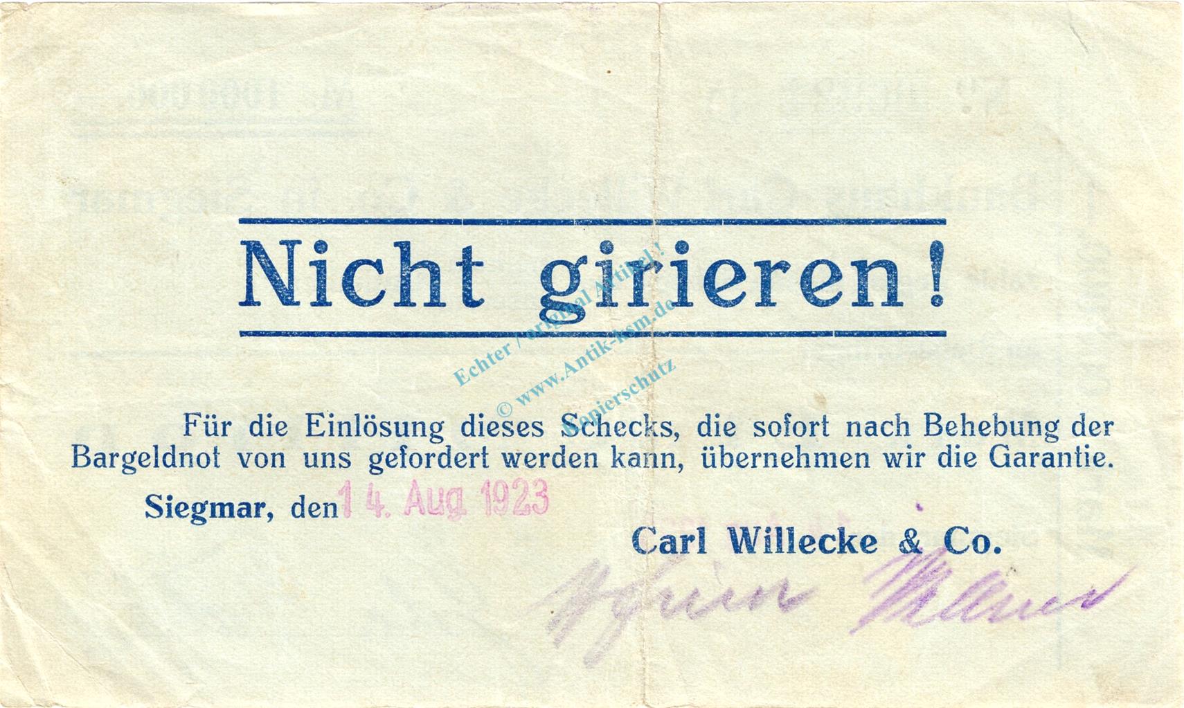 Scheck Carl Willecke & Co. in Siegmar , 14.08.1923 , Ohne Aussteller , 2 HUS -- so im Katalog nicht zu finden --