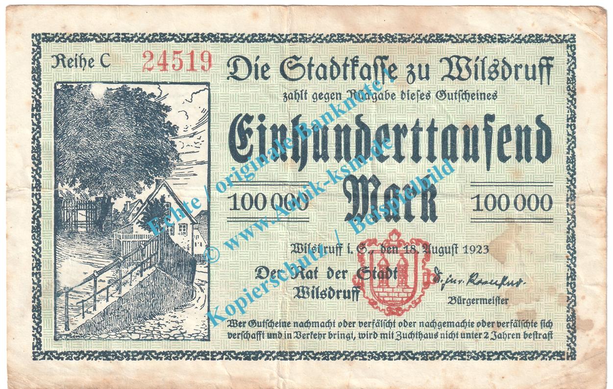 Wilsdruff , Notgeld 100.000 Mark Schein in gbr. Keller 5637.a , Sachsen 1923 Grossnotgeld Inflation