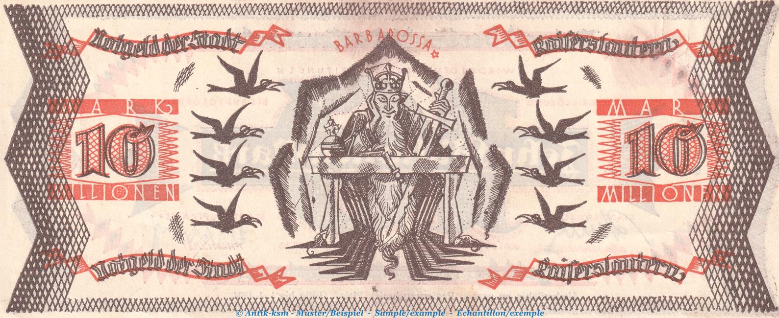 Banknote Stadt Kaiserslautern , 10 Millionen Mark Schein in kfr. Keller 2541.g , von 1923 , Pfalz Inflation