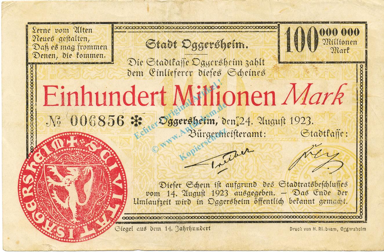 Oggersheim , Banknote 100 Millionen Mark Schein gbr. Keller 4142.e , Pfalz 1923 Inflation
