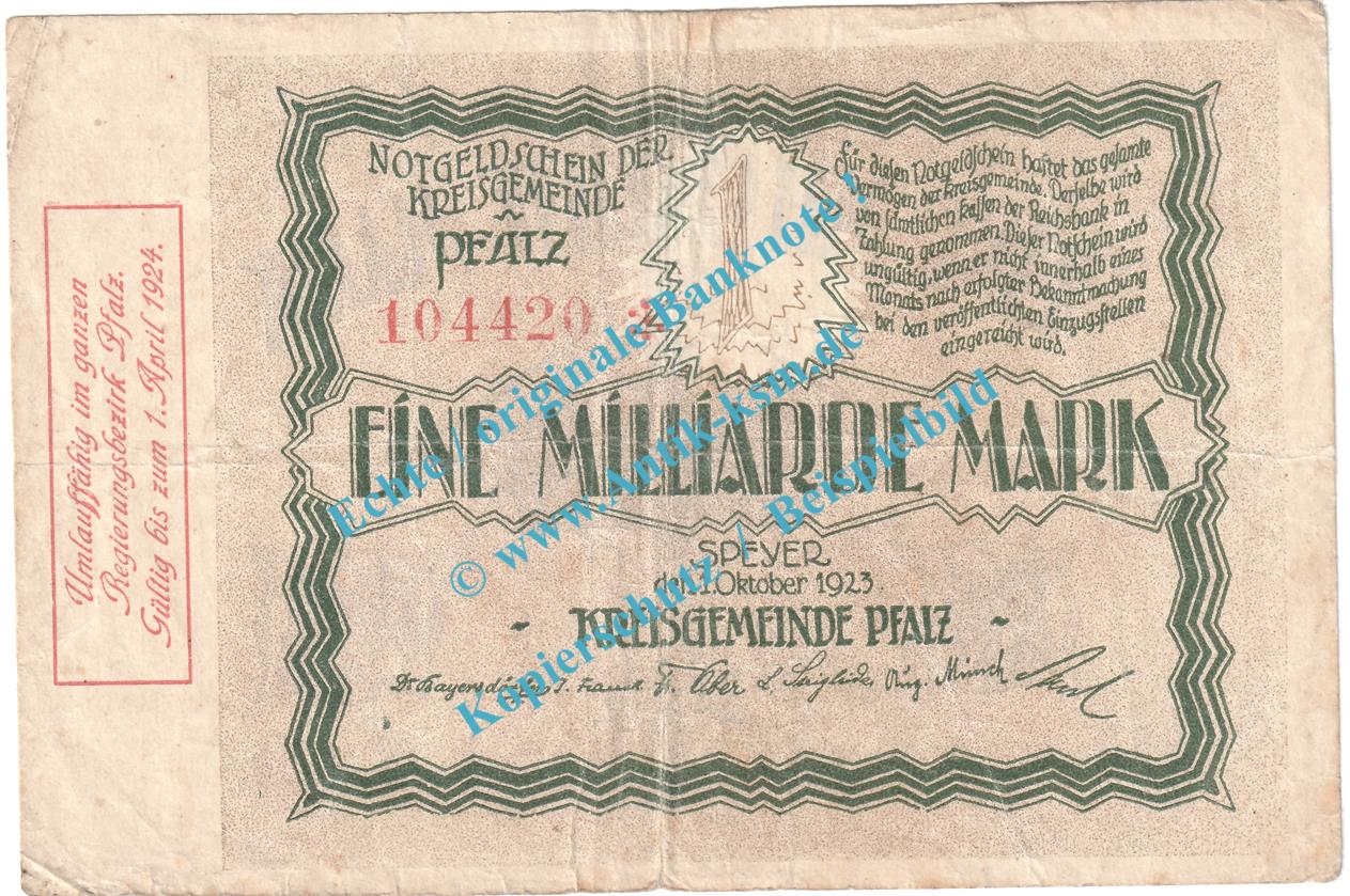 Speyer , Notgeld 1 Milliarde Mark Schein in gbr. Keller 4286.d , Pfalz 1923 Grossnotgeld Inflation