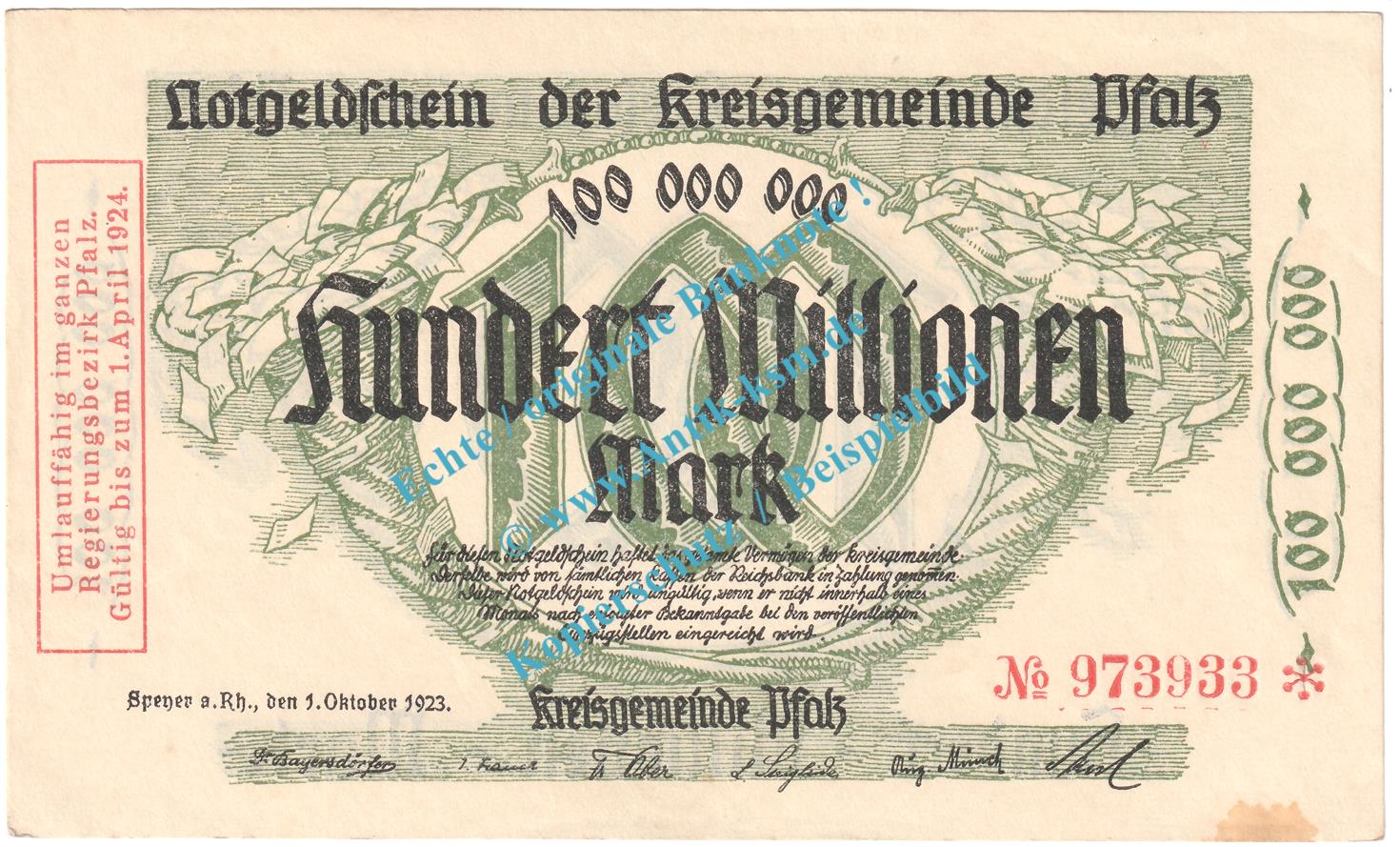 Speyer , Notgeld 100 Millionen Mark Schein in f-kfr. Keller 4286.d , Pfalz 1923 Grossnotgeld Inflation
