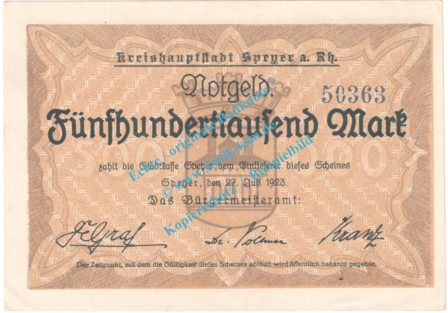 Speyer , Notgeld 500.000 Mark Schein in kfr. Keller 4834.c , Pfalz 1923 Grossnotgeld Inflation