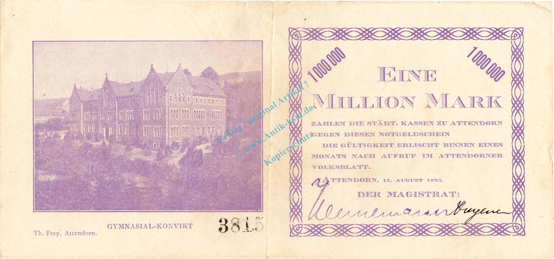 Attendorn , Banknote 1 Million Mark Schein gbr. Keller 171.a6 , Westfalen 1923 Inflation