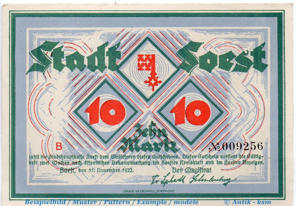Banknote Soest , 10 Mark Schein in kfr. Müller 4330.1.b , 11.11.1922 , Westfalen Großnotgeld