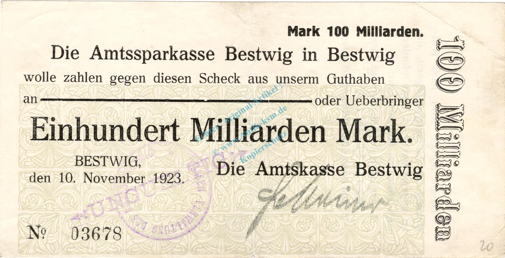 Bestwig , Banknote 100 Milliarden Mark Schein gbr.E Keller 386.d , Westfalen 1923 Inflation