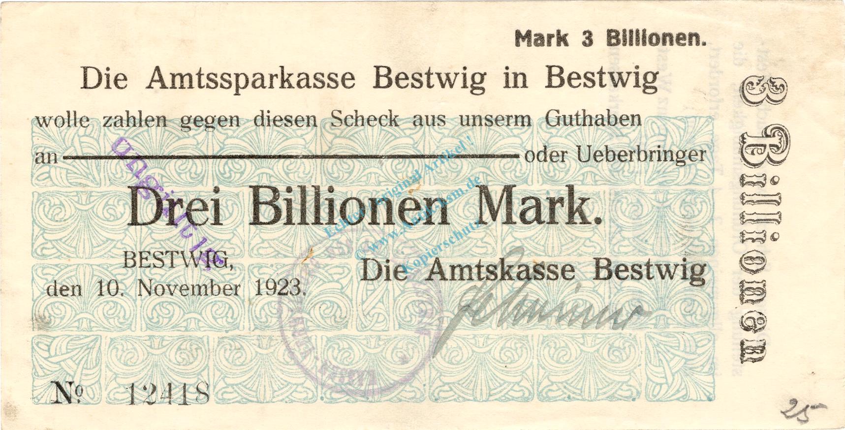 Bestwig , Banknote 3 Billionen Mark Schein unc-kfr.E Keller 386.e , Westfalen 1923 Inflation