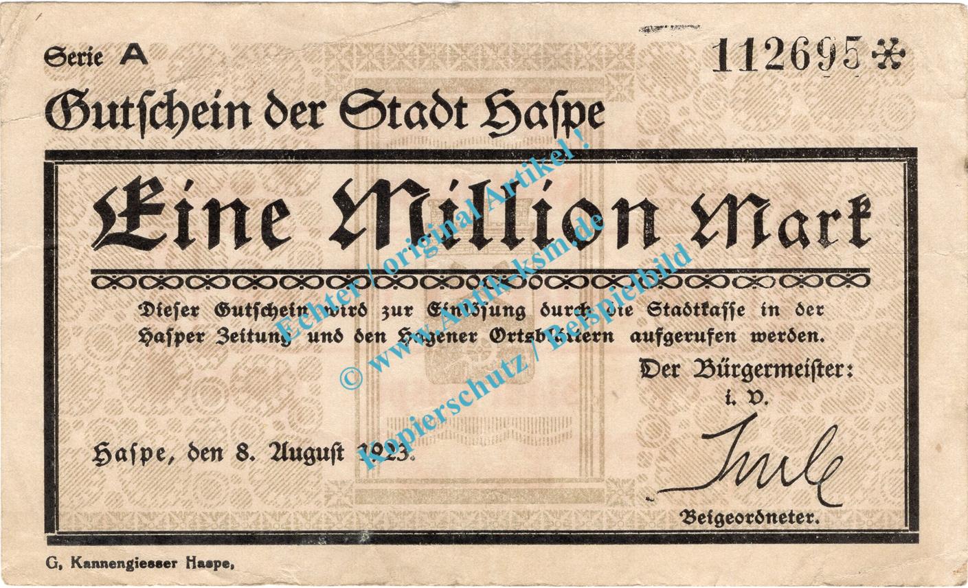 Haspe , Banknote 1 Million Mark Schein in gbr. Keller 2246... Westfalen 1923 Grossnotgeld - Inflation
