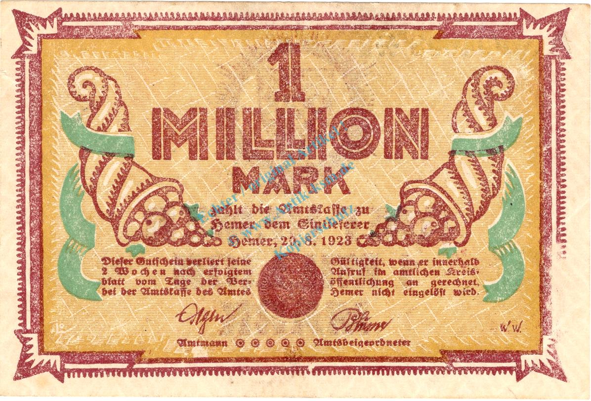 Hemer , Banknote 1 Million Mark Schein L-gbr. Keller 2318 , Westfalen 1923 Inflation