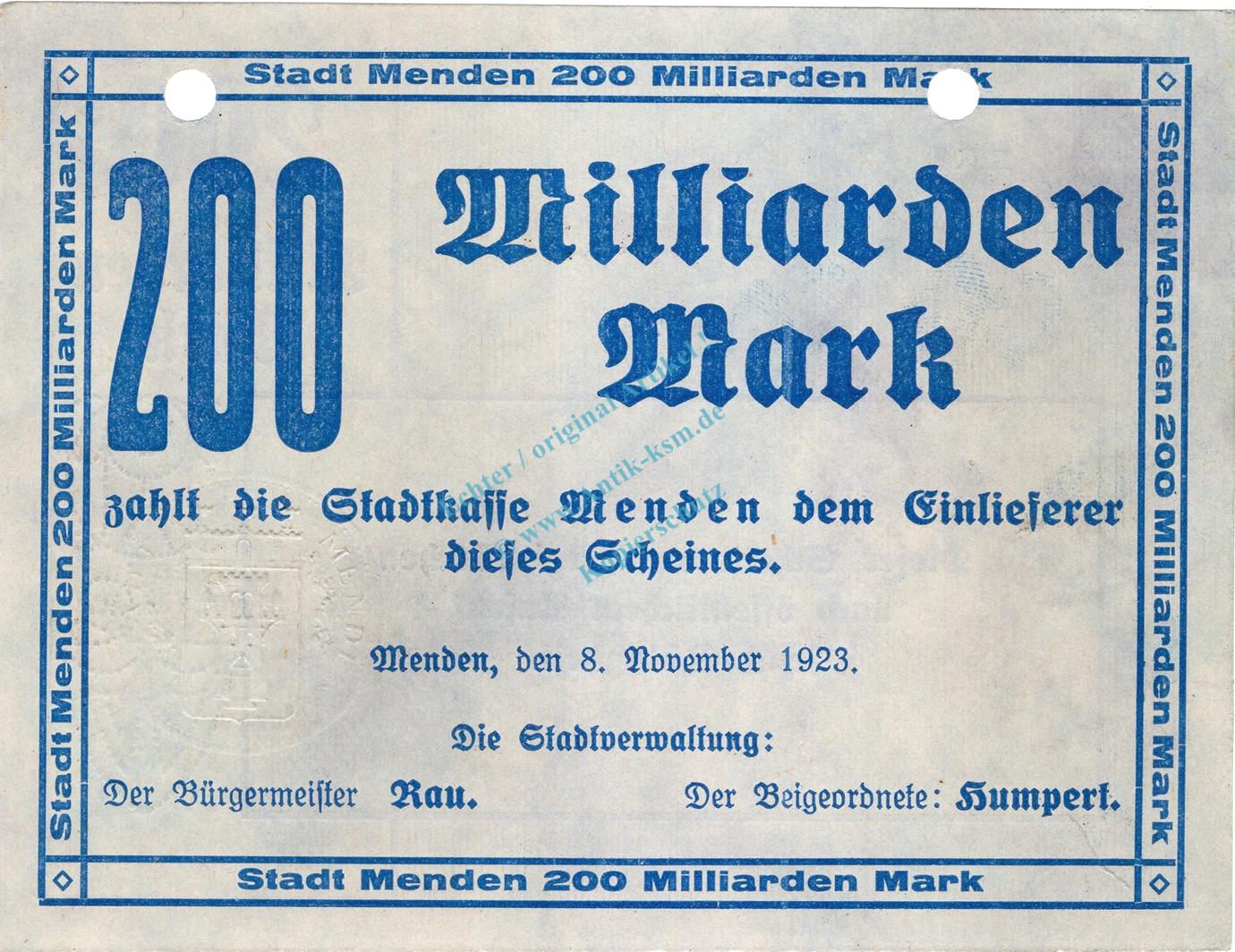 Menden , Banknote 200 Milliarden Mark Schein unc-kfr.E Keller 3516.d , Westfalen 1923 Inflation