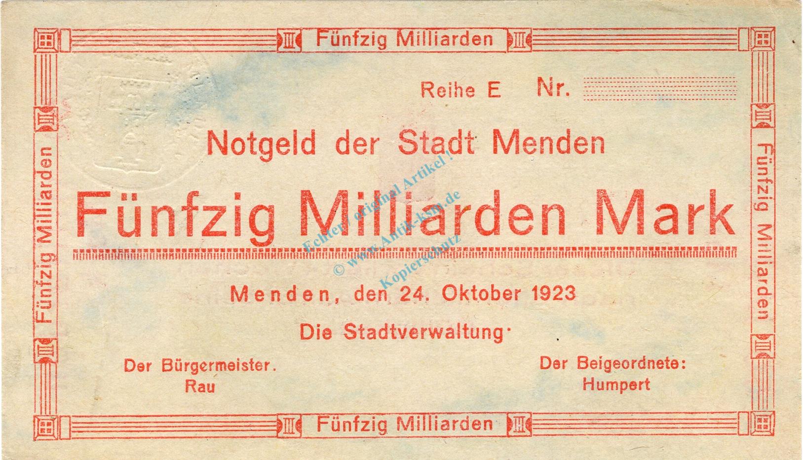 Menden , Banknote 50 Milliarden Mark --MUSTER-- unc-kfr. Keller 3516... Westfalen 1923 Inflation