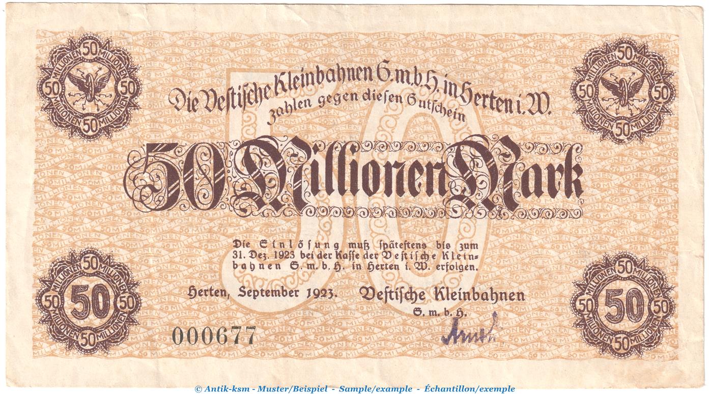 Notgeld v. Kleinbahn Herten , 50 Millionen Mark Schein in gbr. Keller 2358.g von 1923 , Westfalen Inflation